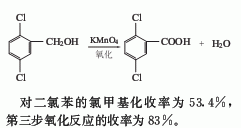2.氯甲基化法由對二氯苯與多聚甲醛作用,再經高錳酸鉀氧化而得。對二氯苯的氯甲基化收率為53.4%,第三步氧化反應的收率為83%